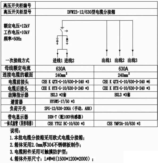 電纜分支箱用于非骨干回路的分支線路,作為結尾負荷接入用電使用,適用于中小客戶會集區域進行負荷分接時的接入用電,不應接入骨干環網及聯絡。電纜分支箱選用電纜進線1回,出線2回或4回,出線回路數可根據使用需要選用,額定電流為630A。選用全絕緣、全封閉、全屏蔽可觸摸式結構,以及采納防凝露、防內部毛病電弧外泄等措施。