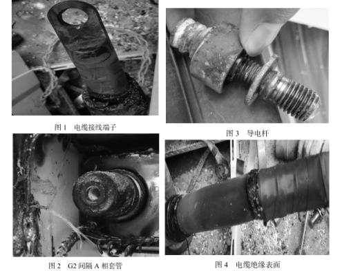 搶修人員對G2距離電纜撤除后,發(fā)現(xiàn)電纜接線端子(如圖1所示)氧化嚴峻,闡明此處遭受過高溫腐蝕,并且應力錐靠近端子處的燒蝕痕跡也闡明晰插頭受高溫腐蝕;現(xiàn)場發(fā)現(xiàn)端子與環(huán)氧套管銅件的觸摸面存在顯著氧化,闡明高溫腐蝕時,端子與環(huán)氧套管銅件外表并未徹底嚴密貼合;查看套管內(nèi)部螺紋亮光正常(如圖2所示),闡明導電桿裝置緊固。環(huán)氧套管遭受高溫痕跡顯著,且銅件外表與端子觸摸面也有很顯著氧化痕跡,闡明在高溫發(fā)生時,端子與環(huán)氧套管銅件外表并未徹底嚴密貼合;現(xiàn)場對導電桿(如圖3所示)進行查看,發(fā)現(xiàn)變徑螺桿氧化,以及銅嵌件脫離環(huán)氧,熔融附于變徑螺桿上,都闡明此處經(jīng)受過高溫傳導;對電纜應力錐剝除后,發(fā)現(xiàn)電纜絕緣外表(如圖4所示)無顯著爬電痕跡,闡明應力體部位未發(fā)生爬電毛病,從絕緣受高溫腐蝕和燒蝕判斷,高溫來自端子部位。