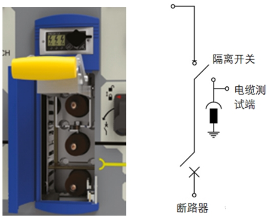 即對三工位開關接地靜觸頭裝置絕緣套管和可拆開的接地短接排,如施耐德的RM6,為了測驗電纜絕緣和查找毛病,有可能在不斷開銜接設備的情況下,經RM6向電纜引進42kV直流實驗電壓,繼續15分鐘;為了經過接地觀察窗引進直流實驗電壓,應閉合接地開關和翻開可移動接地銜接設備,實驗時需運用特殊實驗夾子。