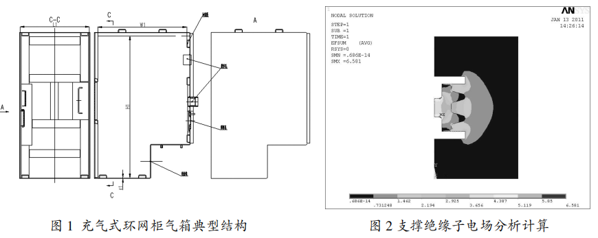 高壓帶電體對地最小空隙處在支撐絕緣子上,通過核算支撐絕緣子的電場如圖2,滿意電場要求,終究確認對地最小空隙。根據最小空隙準則確認氣箱外形尺度(L1xW1xH1)。