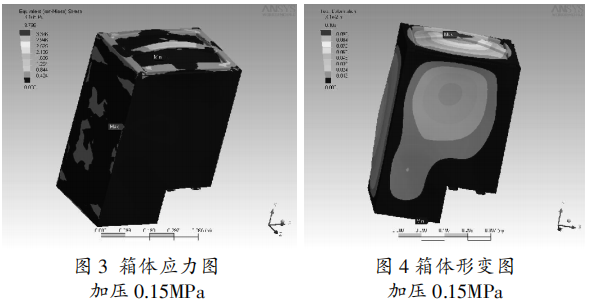 箱壁厚度滿意材料的許應應力要求及氣箱允許變形量要求。通過軟件剖析核算后得到氣箱的應力分布(見圖3)及箱體形變(見圖4),終究找到氣箱壁厚。