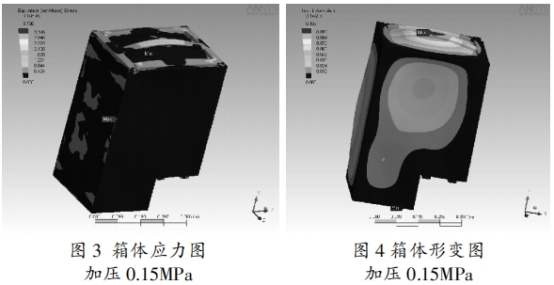 箱壁厚度滿足資料的許應應力請求及氣箱允許變形量請求。經過軟件剖析核算后得到氣箱的應力散布(見圖3)及箱體形變(見圖4),終究找到氣箱壁厚。