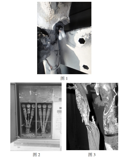 2008年3月24日,回南天,富灣站富油乙線速斷跳閘,位于戶外的一臺(tái)電纜分支箱產(chǎn)生短路爆破(如圖1),601開(kāi)關(guān)出線電纜倉(cāng)門(mén)嚴(yán)峻熏黑,翻開(kāi)后發(fā)現(xiàn)A相電纜終端應(yīng)力錐焚毀,纜芯熔損,初步剖析主要為施工工藝粗糙,構(gòu)成電纜終端電場(chǎng)畸變嚴(yán)峻,一起纜身緊靠固定用金屬支架,在箱內(nèi)潮濕環(huán)境下產(chǎn)成長(zhǎng)時(shí)刻閃絡(luò)放電,畢竟絕緣破損接地短路,將出線套管炸壞,構(gòu)成氣室漏氣,分支箱報(bào)廢。